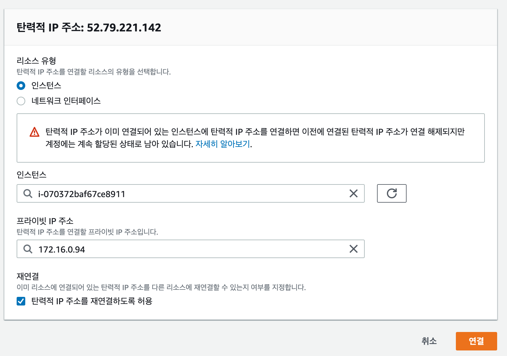 (탄력적)Elastic IP를 생성한 후, [작업] -> [탄력적 IP 주소 연결]을 클릭하고 방금 생성한 NAT 인스턴스를 연결한다.