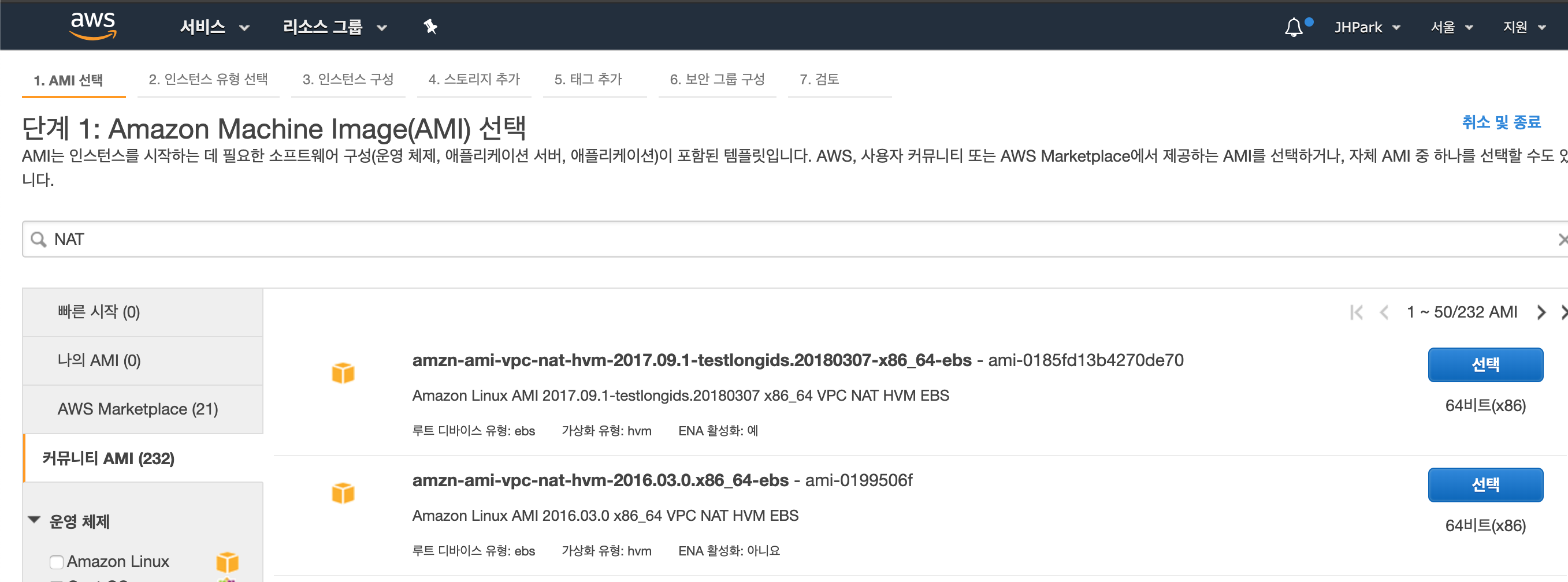 2. EC2를 생성하기 위해 AMI (Amazon Machine Image)를 선택하는데, 검색창에 'NAT'를 검색하여 community AMIs 중에서 하나를 선택한다.(필자는 가장위의 AMI)를 선택하였다.