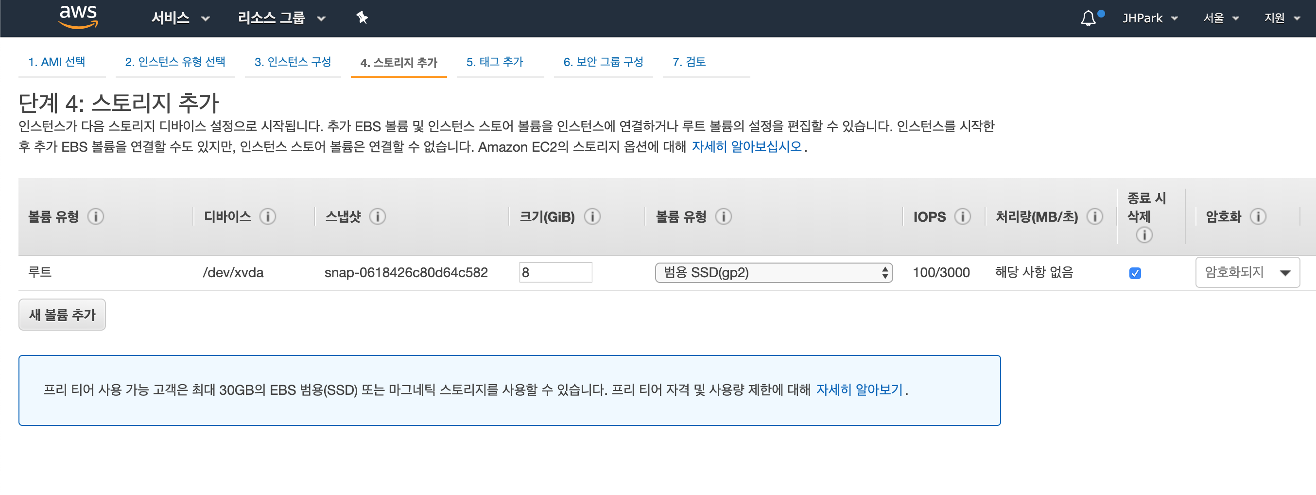 4. 다음으로는 저장공간 설정에서 볼륨유형을 [범용 SSD]로 변경후 [다음]으로 넘어간다.