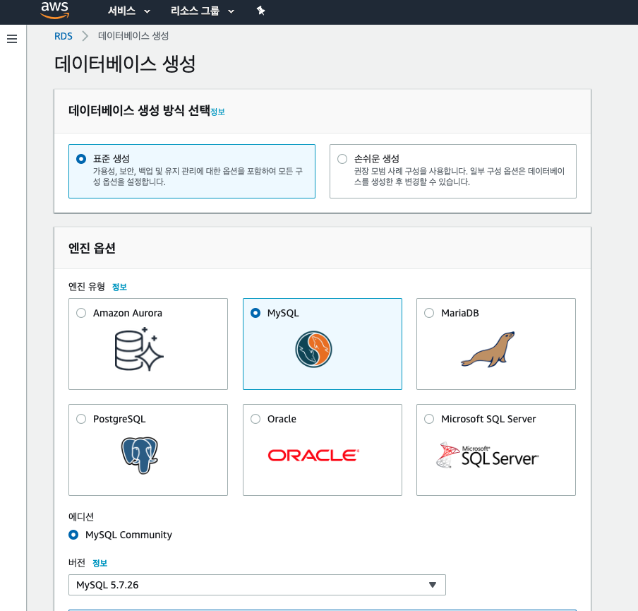 엔진 옵션은 - MySQL 5.7.26을 선택한다(DB는 각자에 맞춰 선택하면 된다. 또한, Maria DB, Oracle, PostfreSQL 등 여러가지 엔진을 지원한다.)