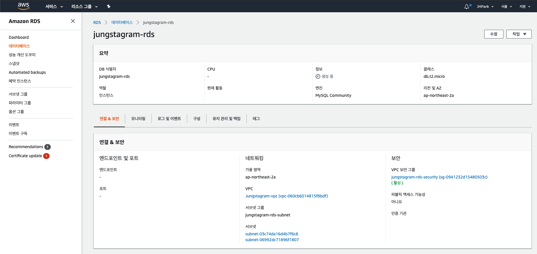 추가적인 서브넷을 생성했으니, 본격적으로 RDS를 생성하겠다.