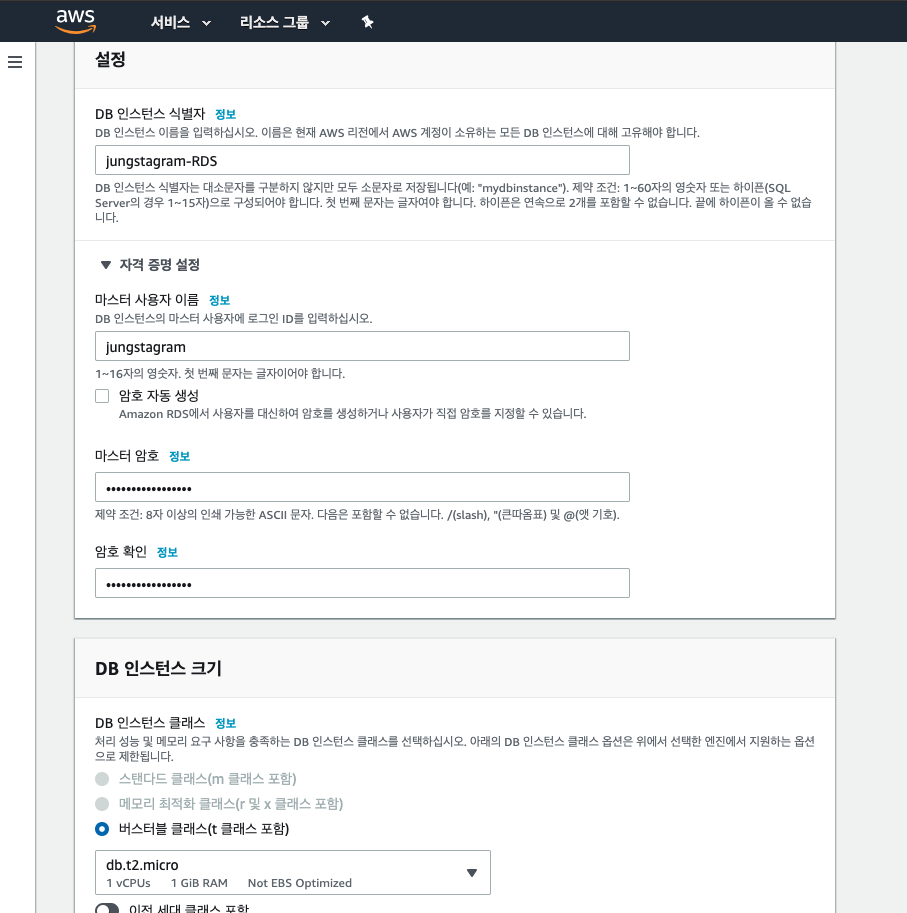 [DB인스턴스 크기]는 프리티어로 생성하면 자동 지정이 되지만, 아니라면 사용환경에 맞게 구상하면된다.