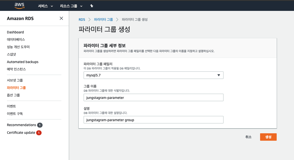 1. [서비스] -> [RDS] -> [파라미터 그룹]에서 [파라미터 그룹 생성]으로 들어간다.