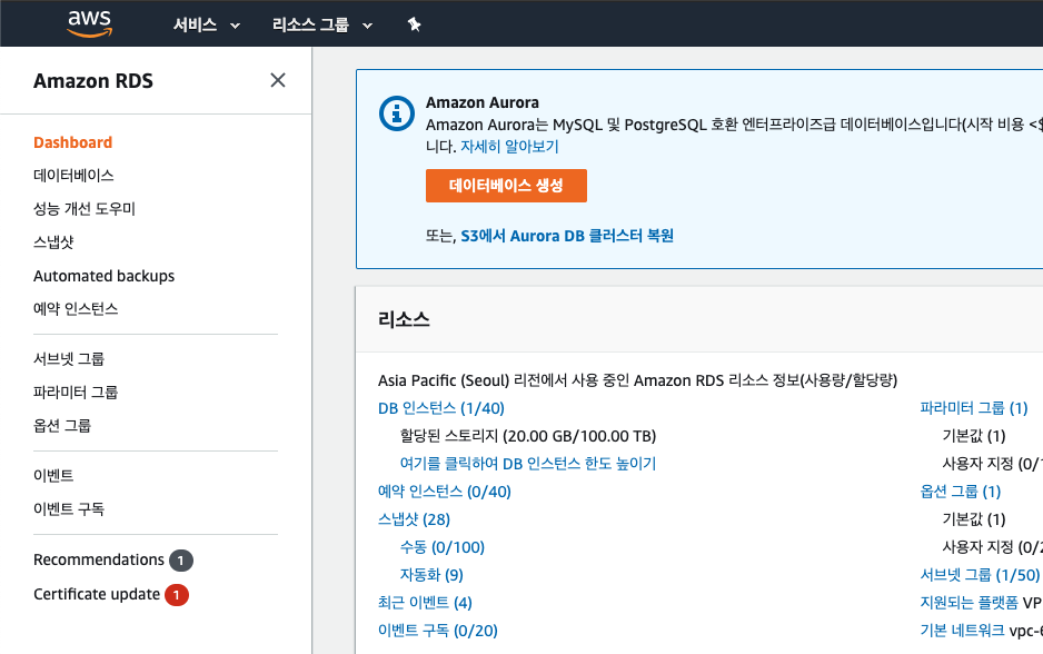 1. [서비스] -> [RDS]를 검색하여 [Dashboard]에서 데이터베이스 생성 버튼을 눌러 시작한다.