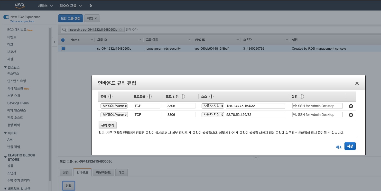 6. 보안그룹 설정창에서 하단의 [인바운드]의 [편집]에서 우리의 웹서버(EC2로 생성한)에서 접속이 가능하도록 포트를 열어준다.