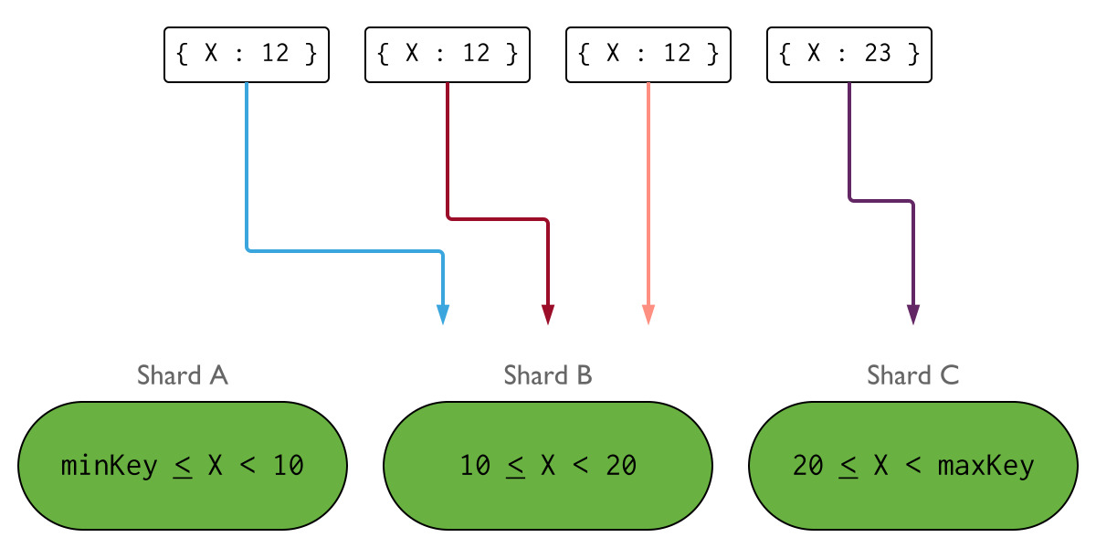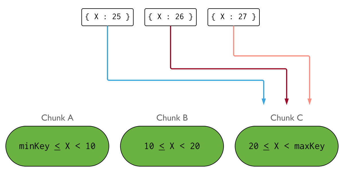 그림에서 보이듯, x를 샤드 키로 설정하여 4개의 Chunks로 나누고, 각 Chunks마다 범위(Ranged Sharding)를 가진다.