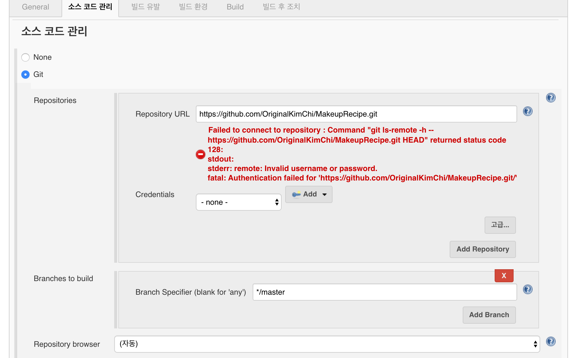 - [소스코드 관리] -> [git] -> [Repository URL]에 동일하게 URL을 입력