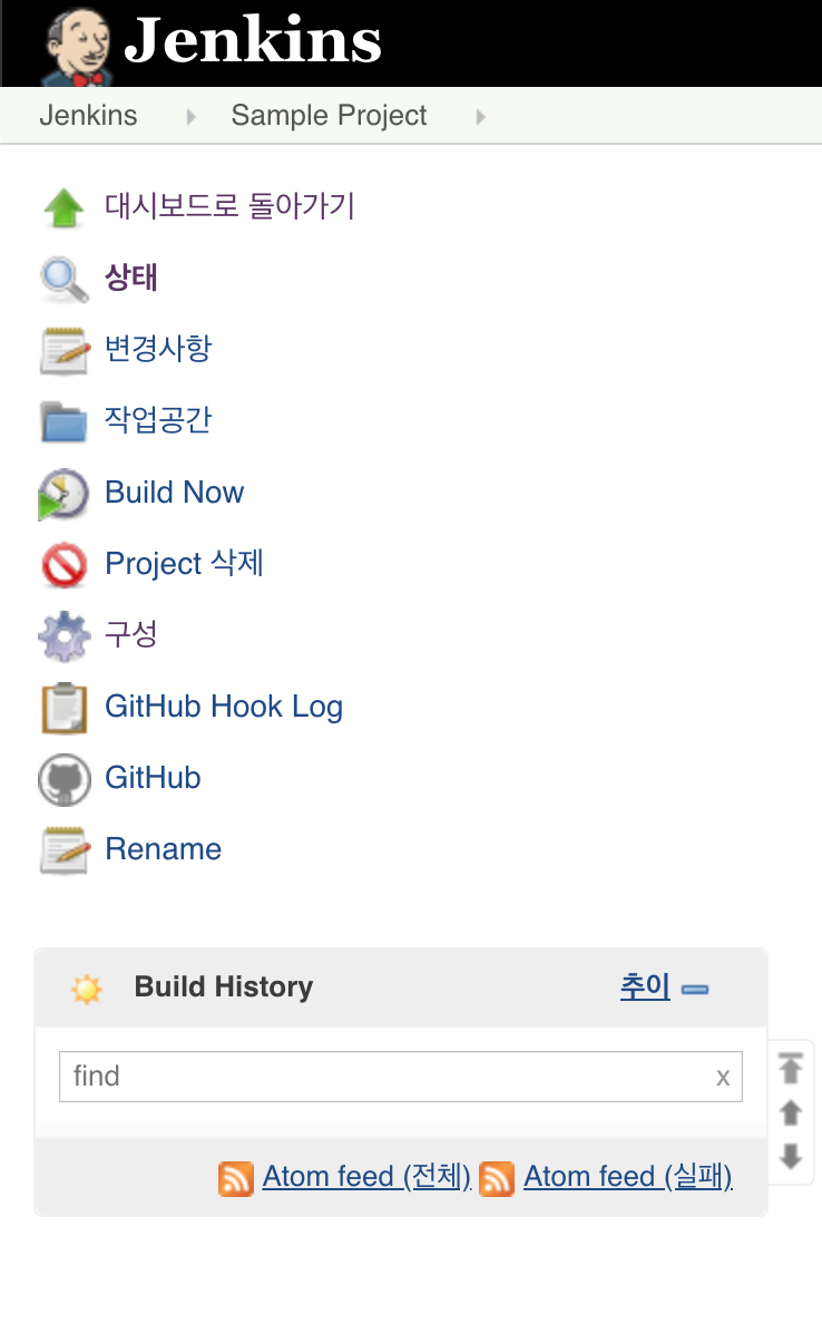 7. 저장이 완료 되면 다음과 같이 프로젝트 메뉴로 들어가게 되는데 Build Now를 통해 바로 빌드를 테스트 해볼 수 있다.
