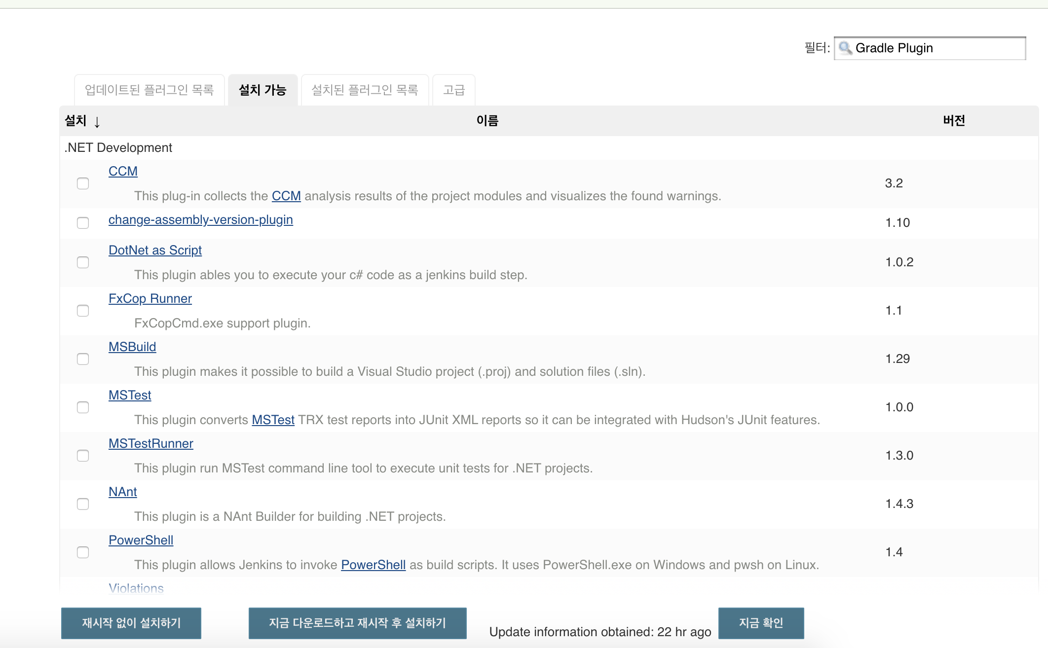 Gradle Pulgin은 gradle 빌드를 위한 플러그인이며, Post build task Plugin은 빌드 로그를 판단하여 Script혹은 shell을 실행할 수 있게하는 플러그인이다. (Jenkins 버전이 따라 설치가 되있을 수도 있으니 '설치 가능'에 보이지 않는다면, '설치된 플러그인 목록'에서 확인)