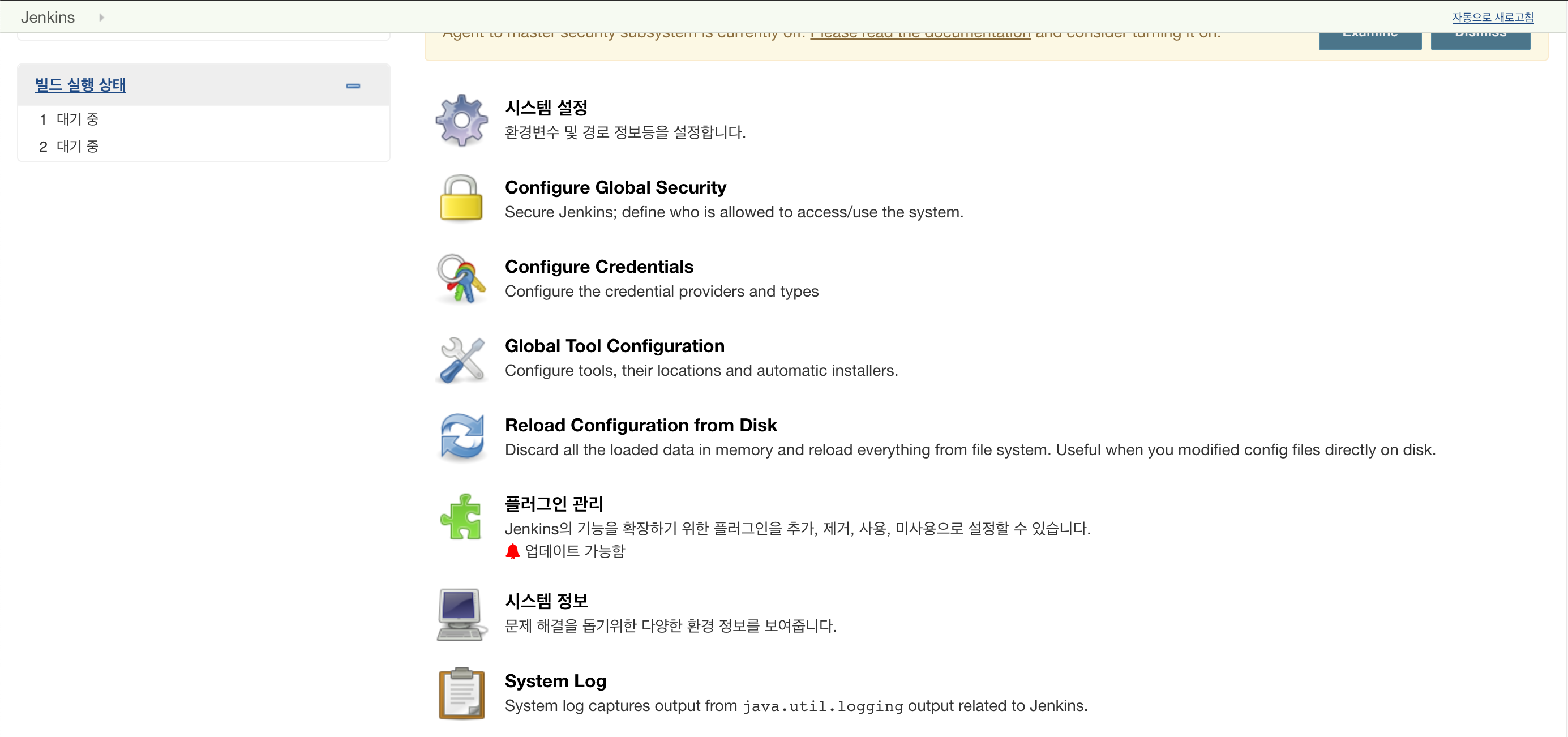 1. 먼저 Spring boot 배포 빌드환경을 위해 플러그인을 설치를 한다. 좌측 메뉴의 [Jenkins 관리]로 들어간다.