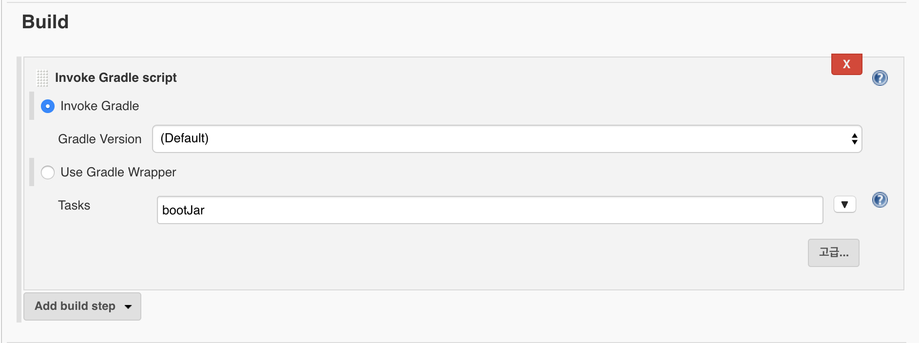 - 빌드를 실행하기 위해 [Build] -> [Invoke Gradle] -> [Gradle version]을 선택하고, [Tasks]에는 'bootJar'를 입력한다.