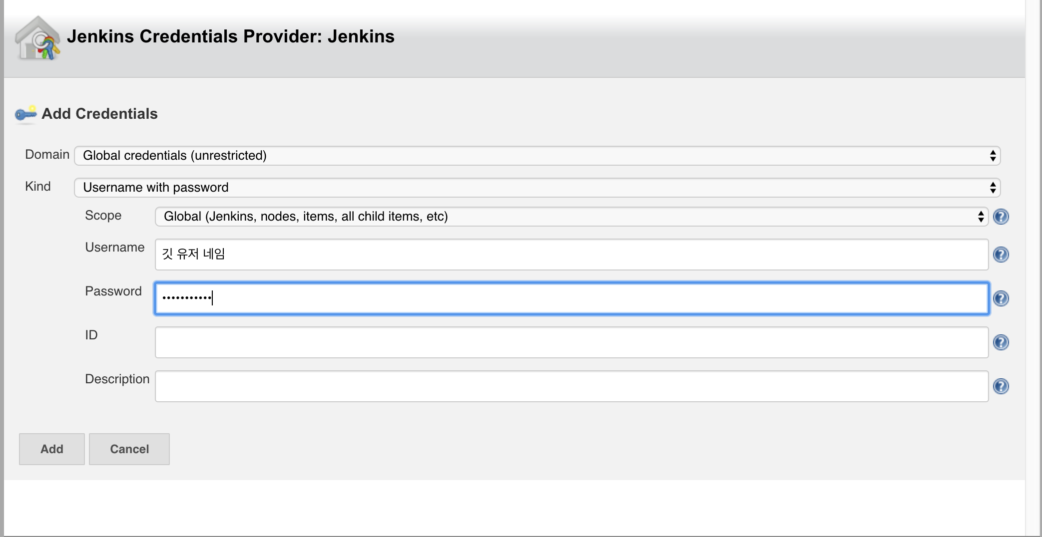 - [Credentials] -> [Add] -> [Jenkins] 에서 [Kind]는 Username With Password를 선택하고, Username과 password를 입력한다.